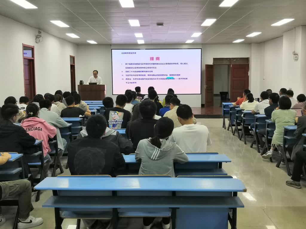5月26日下午,太阳成集团tyc539举行学习贯彻习近平新时代中国特色社会主义思想主题教育专题报告会。公司党委书记单桂锋以《学理论、悟新思、强作风 为公司建设国内知名特色高水平大学建设做出新贡献》为题讲授党课。校团委程建轩老师列席党课报告,院领导班子、党委委员、纪委委员、支部书记、团委书记、支部委员、教工党员和员工党员代表参加。