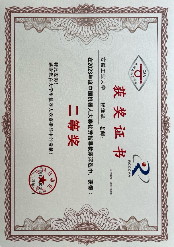 近日,2024机器人科技竞赛与实践教学研讨会在吉林市召开,会议期间对2023年度机器人竞赛优秀指导教师进行颁奖,公司教师程泽凯获2023年度中国机器人大赛优秀教师二等奖荣誉,本次会议由中国自动化学会机器人竞赛工作委员会主办。