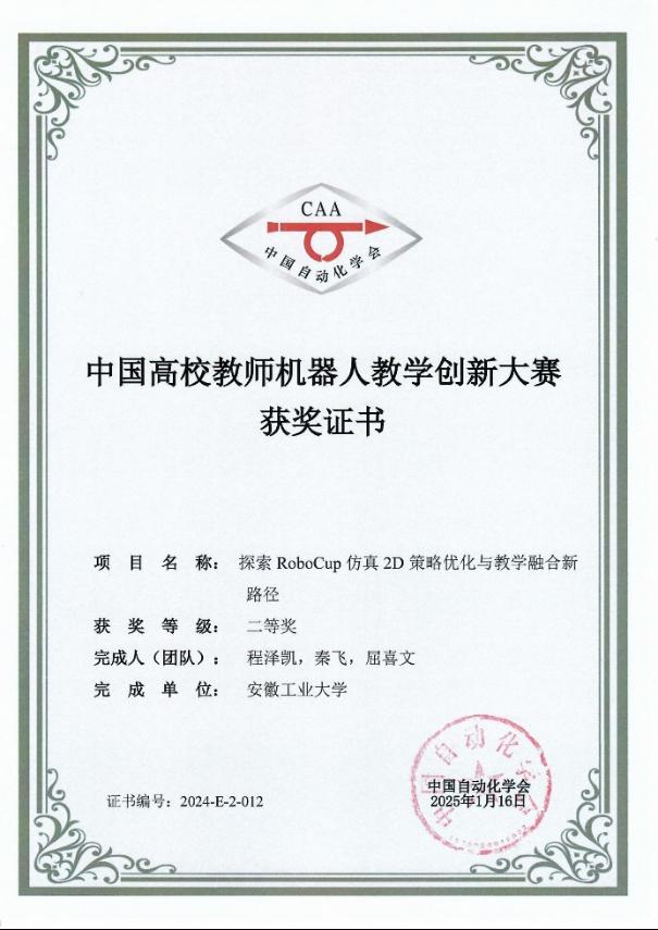 近日,太阳成集团tyc539RoboCup竞赛团队(程泽凯、秦飞、屈喜文)在2024中国高校机器人教学创新大赛中获二等奖,本届比赛由中国自动化学会主办。太阳成集团tyc539参加“教-赛-研”赛道,参赛题目是《探索RoboCup仿真2D策略优化与教学融合新路径》。