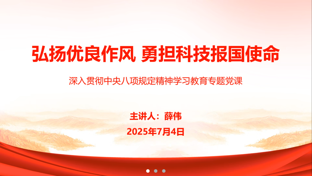 薛伟以在全党开展深入贯彻中央八项规定精神学习教育的目的为切入点,阐述了作风建设对于计算机类专业员工的重要意义。他勉励支部员工党员在人工智能快速发展的时代背景下,要勇于创新,不断提升专业能力与科研素养,并提出三点希望:一是要系统掌握专业知识,夯实科技攻关基础;二是要紧跟前沿动态,增强科技敏感性;三是要坚持知行合一,将理论转化为实际能力。