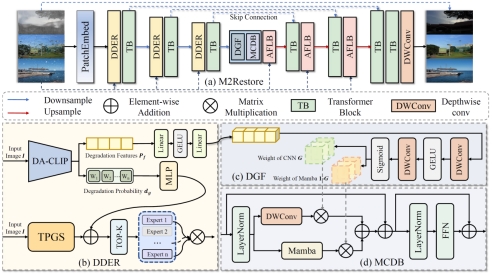 1.构建通用新框架,实现“一体化”图像恢复。作为该系列的旗舰成果,题为《M2Restore: Mixture-of-Experts-based Mamba-CNN Fusion Framework for All-in-One Image Restoration》的论文发表于图像处理领域顶级期刊《IEEE Transactions on Image Processing》。王永振博士为第一作者,其指导的本科生李勇俊为第二作者,此项成果实现了公司首次作为第一单位在该顶级期刊发表论文。此项研究致力于解决现有图像复原模型的两大核心瓶颈:一是面对噪声、模糊、雨、雾等复杂多变的混合退化场景时泛化能力不足;二是难以在保持局部精细纹理与建模全局语义依赖之间取得平衡。为此,团队提出一种全新的M2Restore框架。其核心创新在于构建了一个动态智能的“混合专家”系统,通过引入预训练的CLIP视觉语义先验,并结合可学习的任务提示,使模型能够自主识别图像中不同的退化类型与区域,从而动态调度最合适的专家网络进行处理,实现了单一模型对多种未知或复合退化的自适应精准复原。