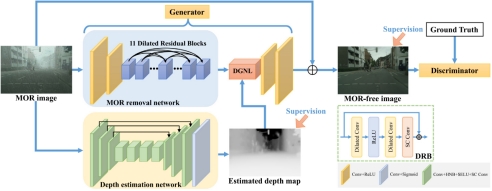 4.攻坚特定难题,深度引导混合雨雾去除新方法。针对真实场景中多种雨水(雨滴、雨线、雨雾)混合叠加这一特定难题,论文《Rethinking Mixture of Rain Removal via Depth-Guided Adversarial Learning》提出了一种基于深度引导的对抗学习框架,该论文发表于神经网络领域权威期刊《Neural Networks》,王永振博士为论文第一作者。该研究通过引入场景的深度信息作为一种额外的先验知识,将深度估计任务与混合雨雾去除任务相结合,构建了一种名为DEMore-Net的联合学习网络。该网络充分利用了雨水分布与场景深度的联系,通过深度信息指导网络在根部不同距离对不同类型的雨水进行精准去除,有效提升了模型在复杂雨雾场景下的泛化能力与复原精度。