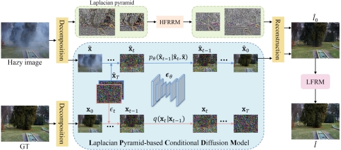 3.探索生成新范式,扩散模型实现高保真实景去雾。在论文《Real-Scene Image Dehazing via Laplacian Pyramid-based Conditional Diffusion Model》中,深入探索了扩散模型在真实复杂雾天场景下的应用。该文发表于多媒体领域顶级期刊《IEEE Transactions on Multimedia》,王永振博士为论文第一作者,刘恒教授为通讯作者。该研究针对真实场景中复杂、非均匀的雾霾分布,传统去雾方法常因训练数据有限、域差异大而表现不佳。为此,探索了一种基于生成式扩散模型图像去雾方法。具体来说,这里提出一种拉普拉斯金字塔条件扩散模型用于真实场景图像去雾,并通过多尺度分解与精细化生成机制,在彻底去除雾霾的同时,尽可能保留图像的结构细节与色彩真实感。该模型是首次将拉普拉斯金字塔与条件扩散相结合,将输入图像分解为低频结构信息与高频细节残差,分别在低分辨率空间进行扩散去雾和高频重建,大幅提升了推理效率并避免了信息损失。此外,通过引入低频细化模块,进一步挖掘训练数据中的深层信息,增强了模型在真实雾霾场景下的复原性能。