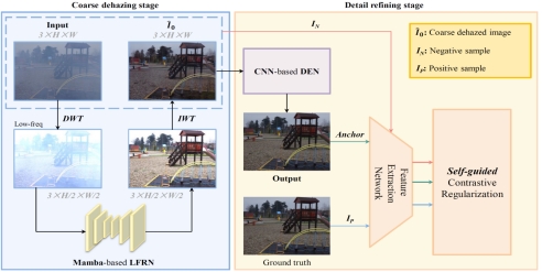为了进一步提升模型复原效果的自然度与真实性,该研究还提出了一个巧妙的“自引导对比正则化”策略。该策略将第一阶段产生的粗略去雾结果作为一种“有难度的负样本”,迫使网络最终的输出在特征空间中远离这个仍有缺陷的中间结果,从而更精准地向清晰无雾的图像靠近。这些设计使得WDMamba不仅在合成与真实雾霾数据集上取得了领先的定量结果,更在视觉上实现了细节保留与色彩保真的优异平衡,为复杂场景下的高效图像去雾提供了新颖且有效的解决方案。