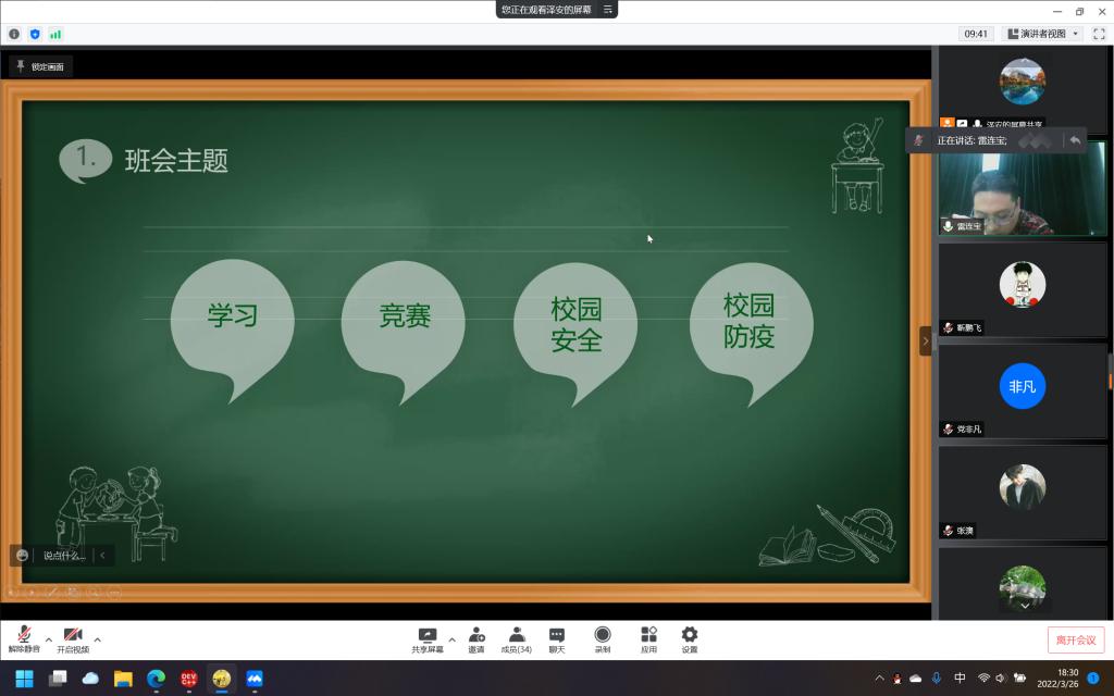 为进一步做好疫情防控期间班级管理工作,3月27日,太阳成集团tyc539计203班召开线上主题班会,班主任雷连宝老师和全体同学参加了视频会议,会议由班长劳安同学主持。