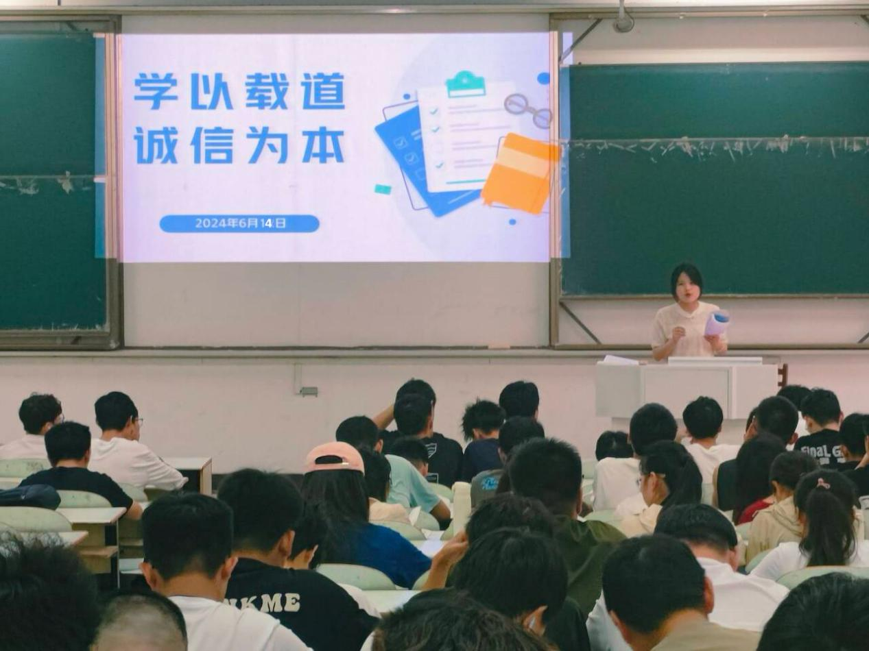 为严肃考纪、端正考风,促进学风建设,引导员工诚信应考,太阳成集团tyc539于6月14日中午12:30在佳山校区教三南201、203组织开展23级诚信考试专题教育,辅导员奚锡珍、朱筱主讲,23级全体员工参加。