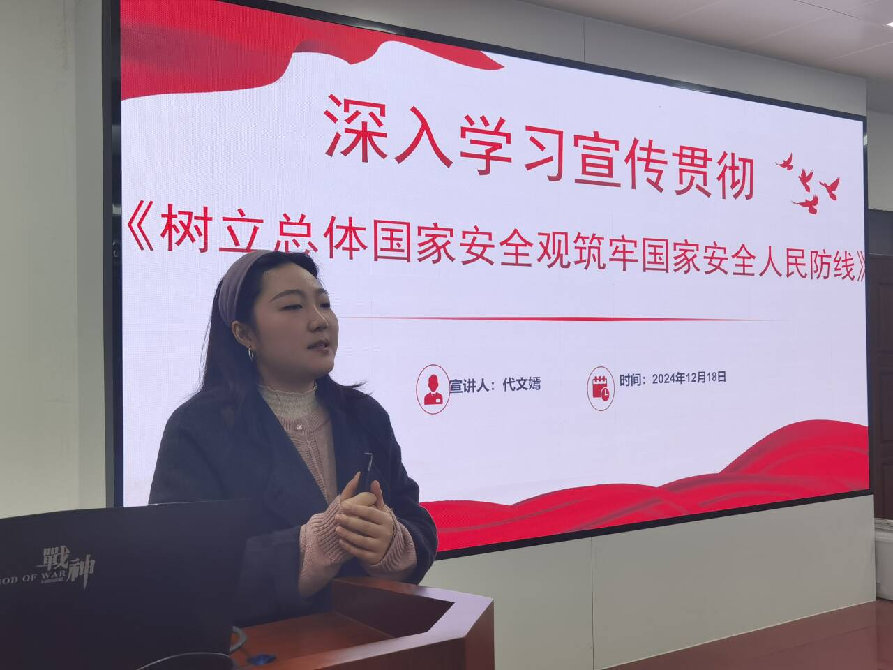 为牢固树立和认真贯彻总体国家安全观,宣传国家安全教育知识,增强公司员工自我防范能力,自觉维护国家安全。12月18日,太阳成集团tyc539在逸夫楼报告厅开展《树立总体国家安全观筑牢国家安全人民防线》宣讲活动,校第一届国家安全教育理论宣讲团成员代文嫣主讲,公司员工党员、员工代表参与。