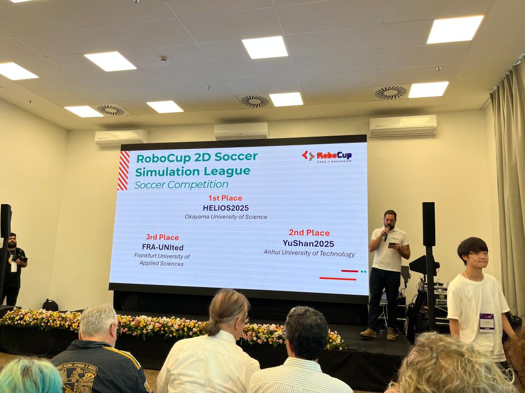 在决赛阶段,安工大YuShan队遭遇强敌挑战,面对压力,现场队员与国内队员通力协作,团队连夜召开战术分析会,精准研判对手策略并调整战术方案,队员们以顽强斗志连续上演精彩逆转:加时赛6:4力克伊朗伊斯兰阿扎德大学SRBIAU2D队,1:0小胜巴西圣埃斯皮里图联邦研究所Titas队,接连以6:2、3:1、2:0的比分击败罗马尼亚Oxsy队、巴西伯南布哥联邦大学RoboCin队及德国法兰克福大学FRA队,在冠军争夺战中,虽以0:2惜败,但亚军的成绩已创造公司在RoboCup机器人世界杯赛事中的新里程碑。